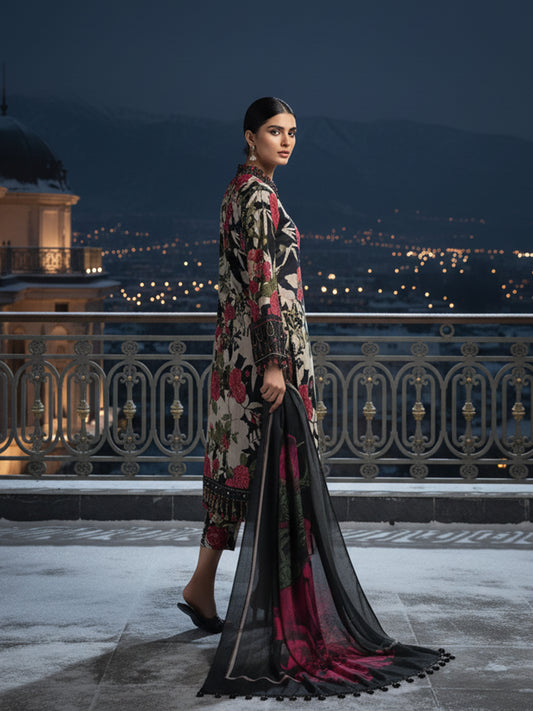 BAROQUE Scarlet Noir: Designer Dhanak 3PC - Black Base with Mega-Floral Dupatta Print