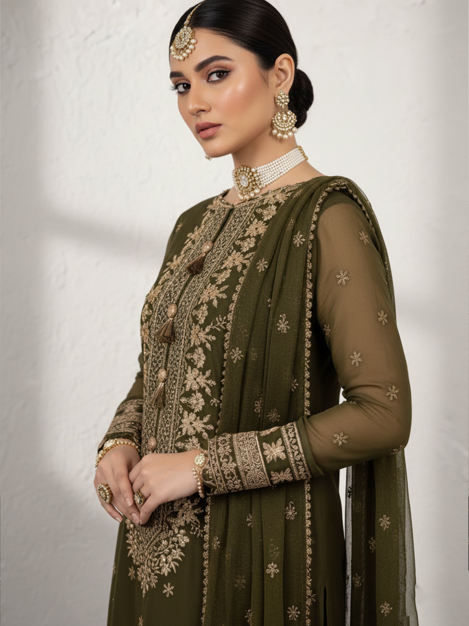Elevate your festive wardrobe with this breathtaking Deep Olive Green 3-piece unstitched suit, inspired by the timeless elegance of Asim Jofa’s formal wear collection. Crafted from high-quality fabrics and adorned with intricate heavy embroidery, this ensemble is designed to make you the center of attention at any formal gathering, wedding, or celebratory event.